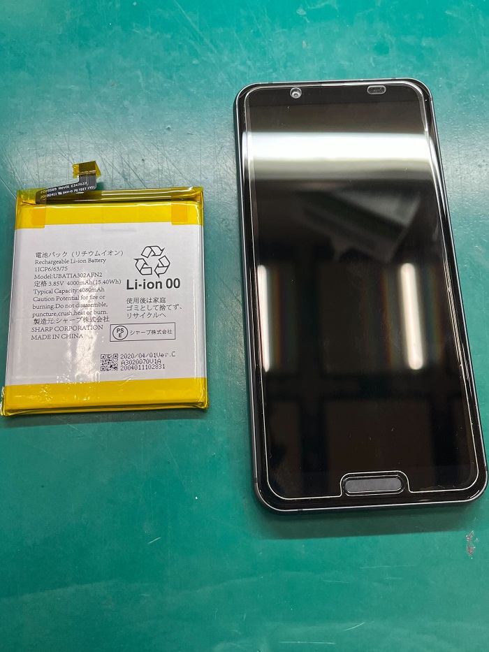 「急に電源が落ちることがある…」とのことで、バッテリー劣化が疑われました。AQUOS Sense3 liteは、発売から数年経っている機種なので、バッテリーの寿命がきていても不思議ではありません。