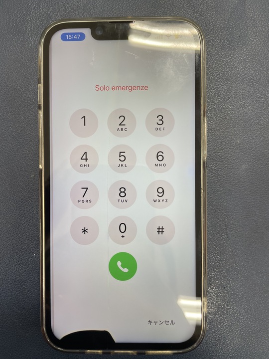 iPhone14 の液晶漏れ(黒いシミ・にじみ・線が入る)による画面交換修理 をご依頼いただきました。