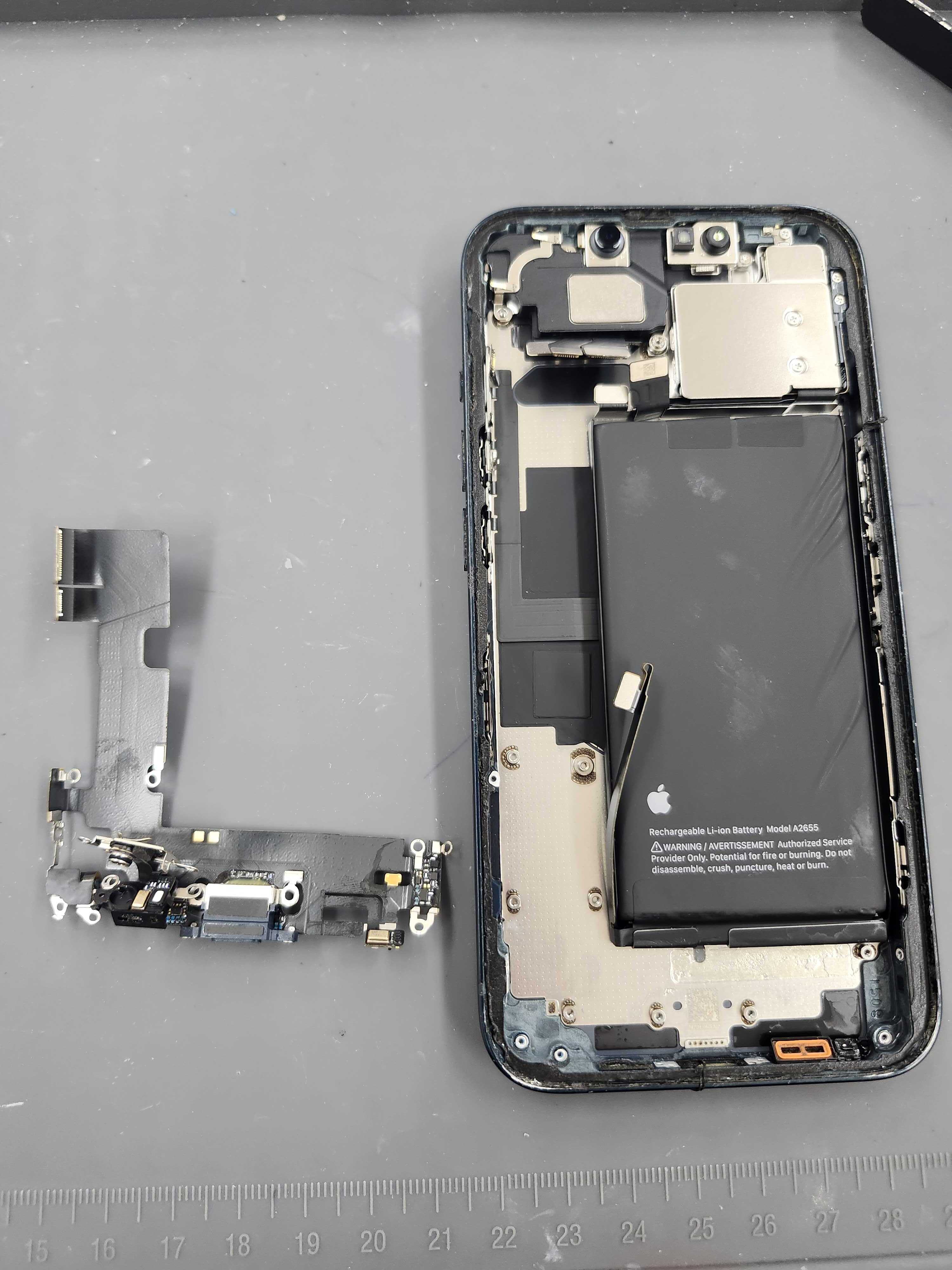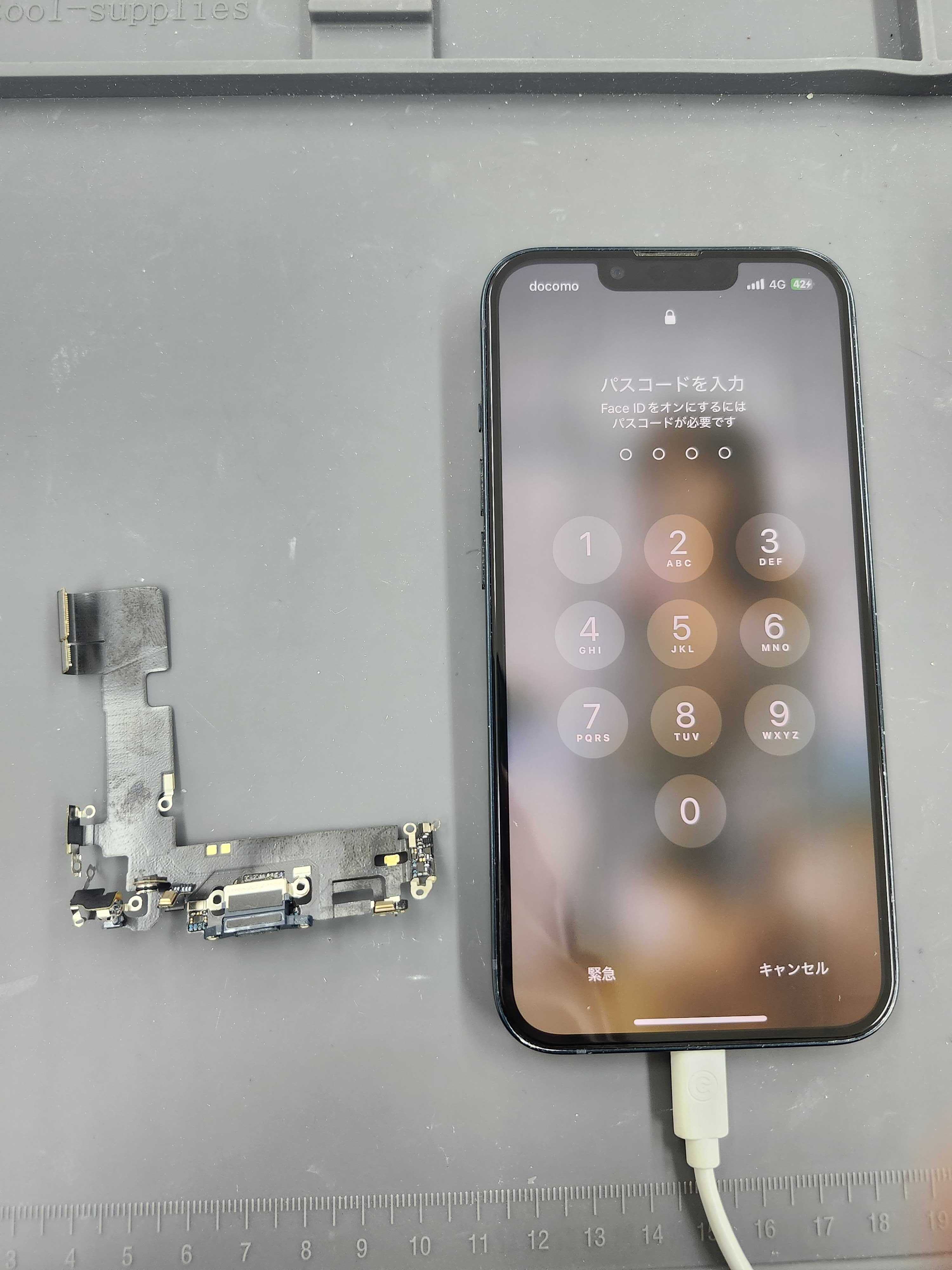 iPhone13 は充電ドックが基盤の下に潜り込む構造のため、作業難度はやや高めです。