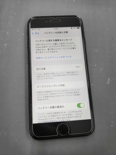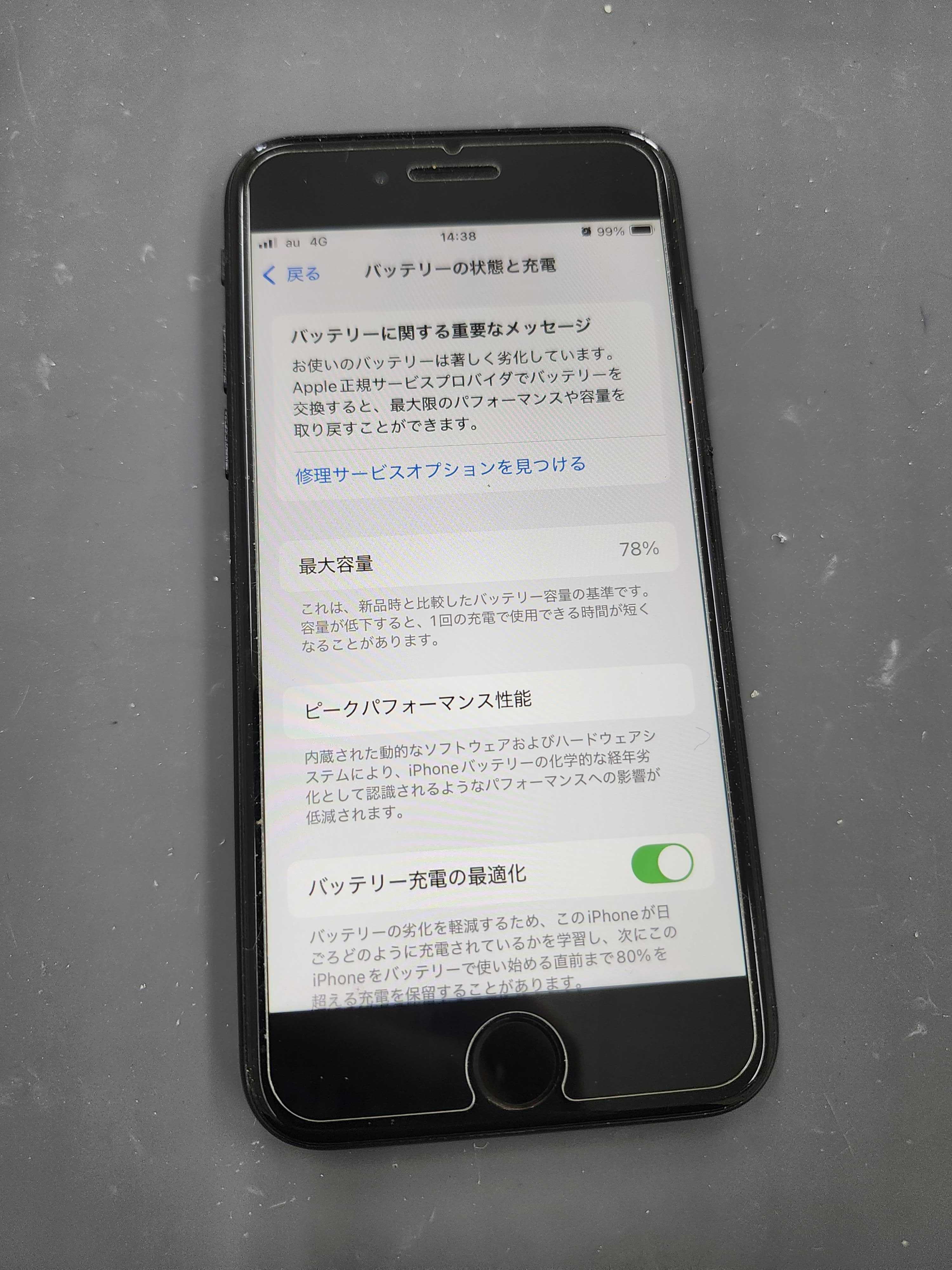 こちらの最大容量が80%を下回る、もしくはAppleさんの方よりバッテリーが劣化しているとメッセージが届いておりますとバッテリー交換の目安となります!😖