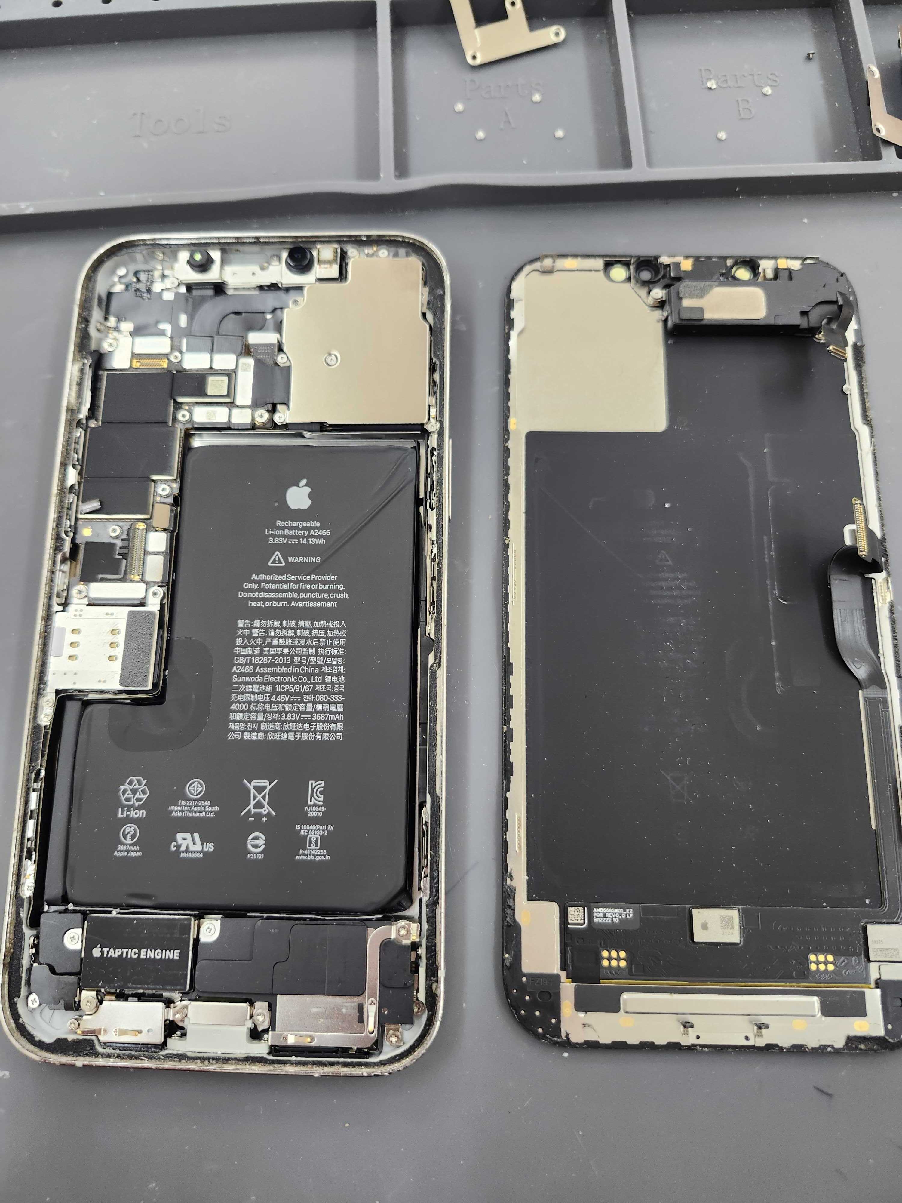 iPhone12シリーズは側面から開く構造のため、ヒートガンで温め粘着を弱めてから慎重に展開します。