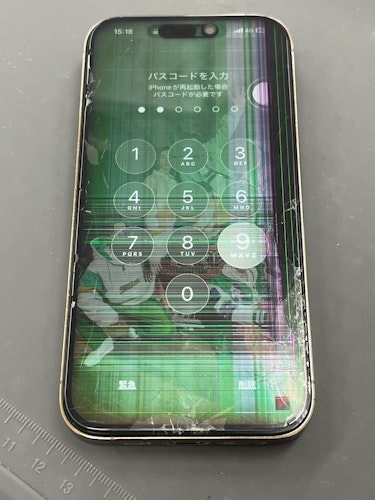 今回お持ち込みいただいたiPhone14 Proは、落下の衝撃により画面全体にヒビが入り、さらにカラフルな線が表示されている状態でした。