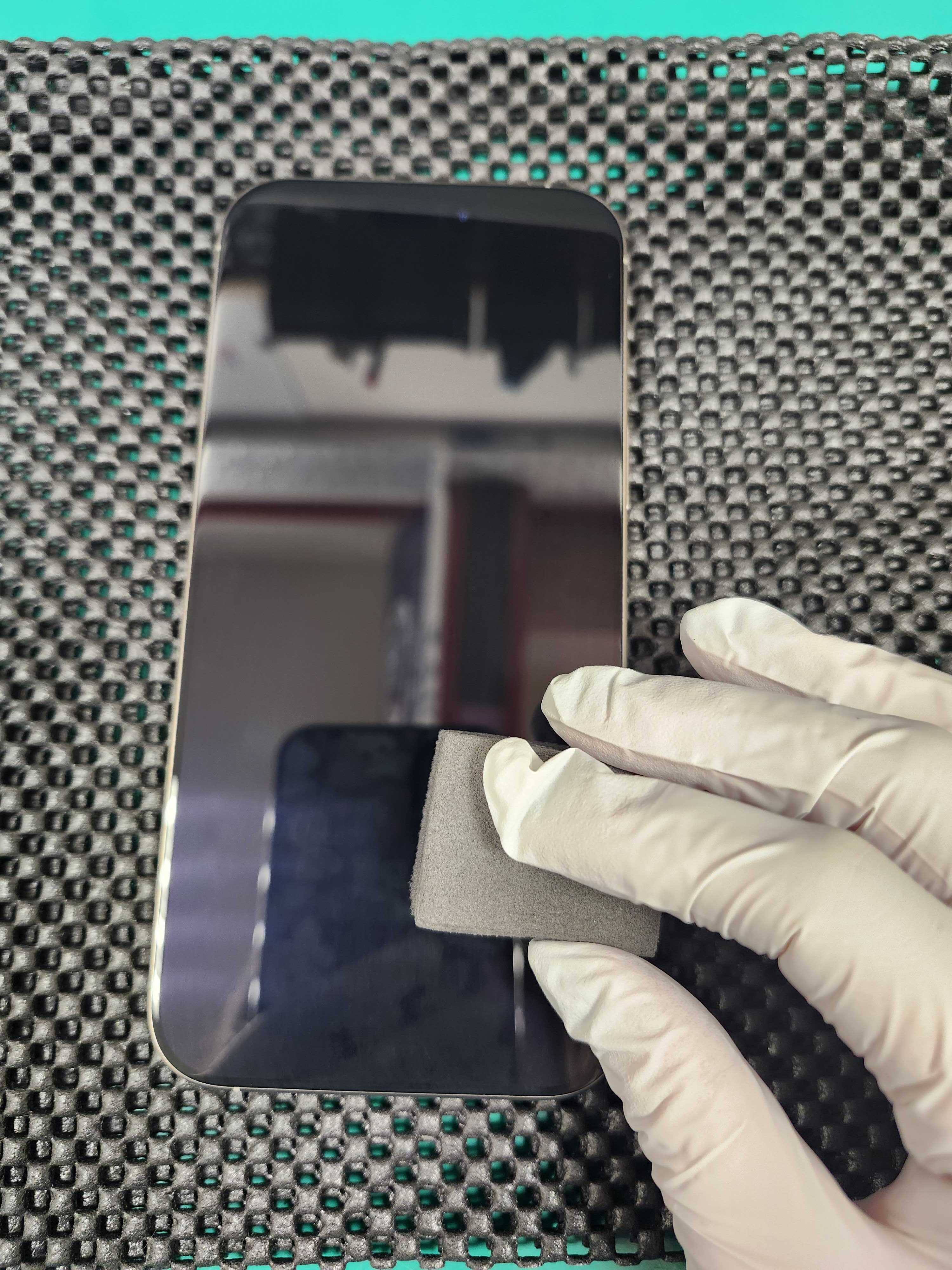 まずはスマートフォン表面の油分や微細な汚れを専用スポンジで丁寧に除去していきます。