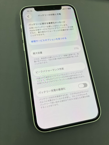 設定画面で確認すると、バッテリー最大容量が80%を下回っている状態でした。