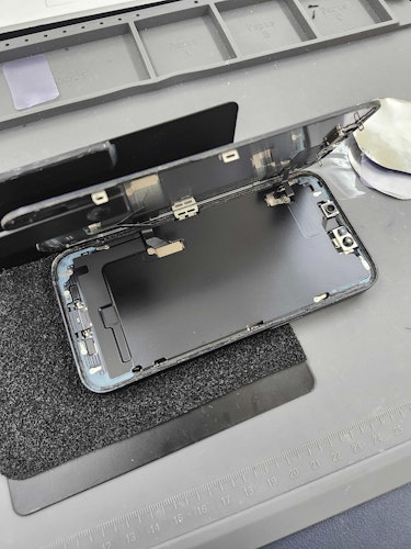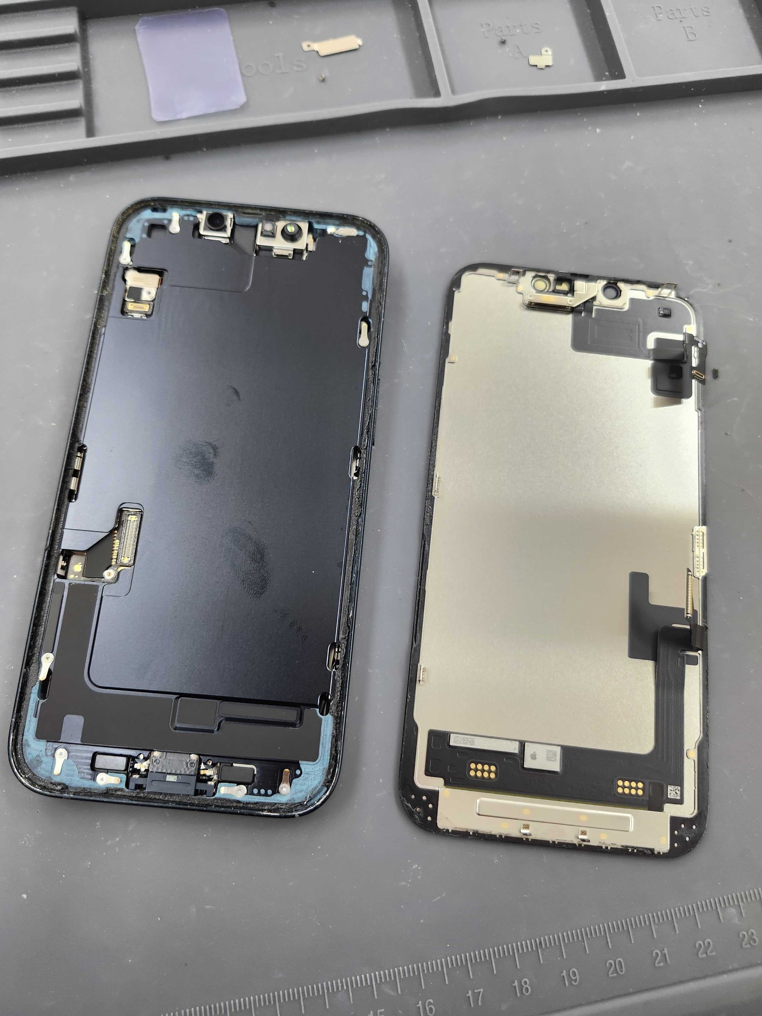 iPhone14の画面交換では、Face IDに関わるイヤースピーカー・センサー類を慎重に移植する必要があります。