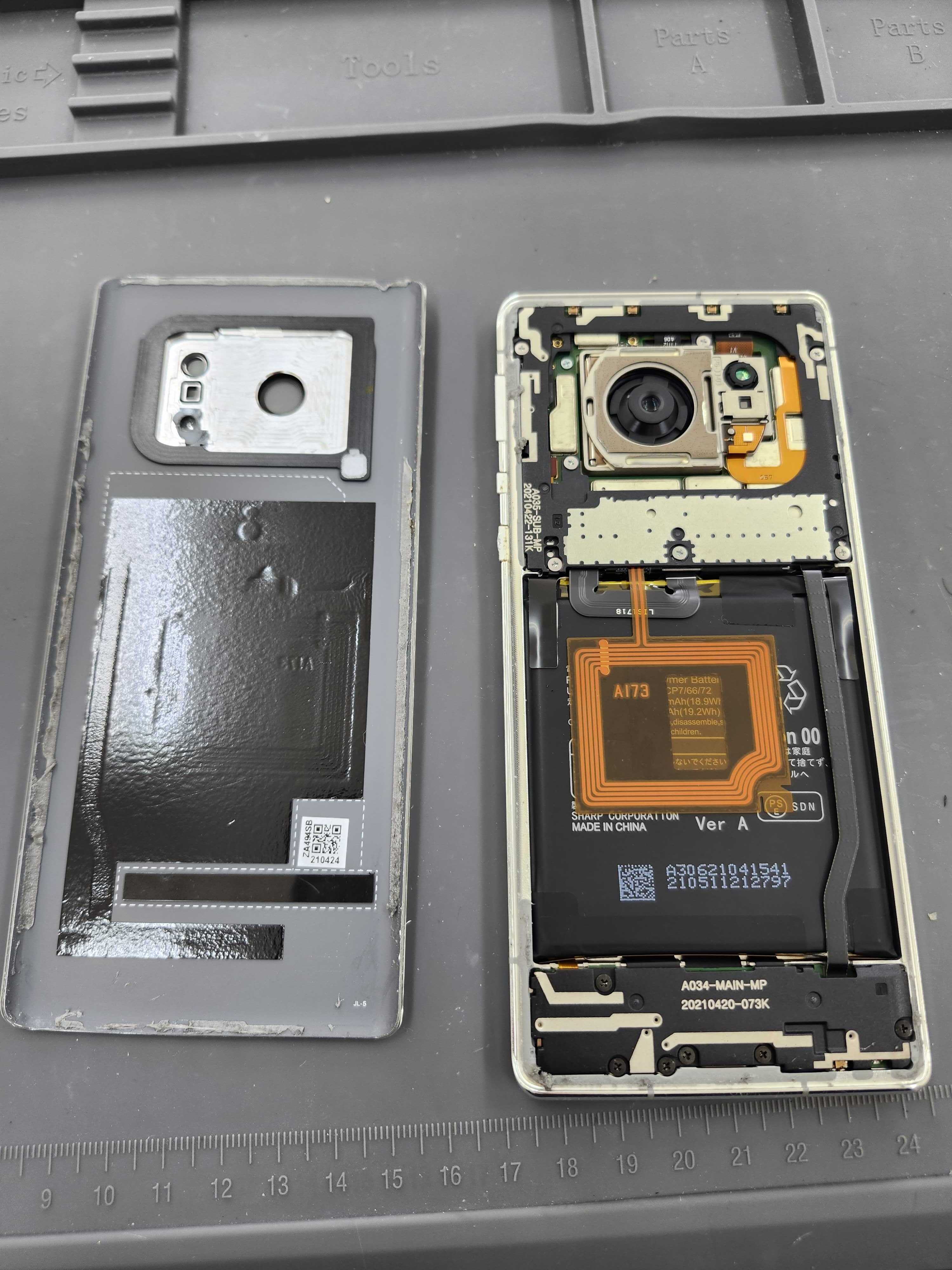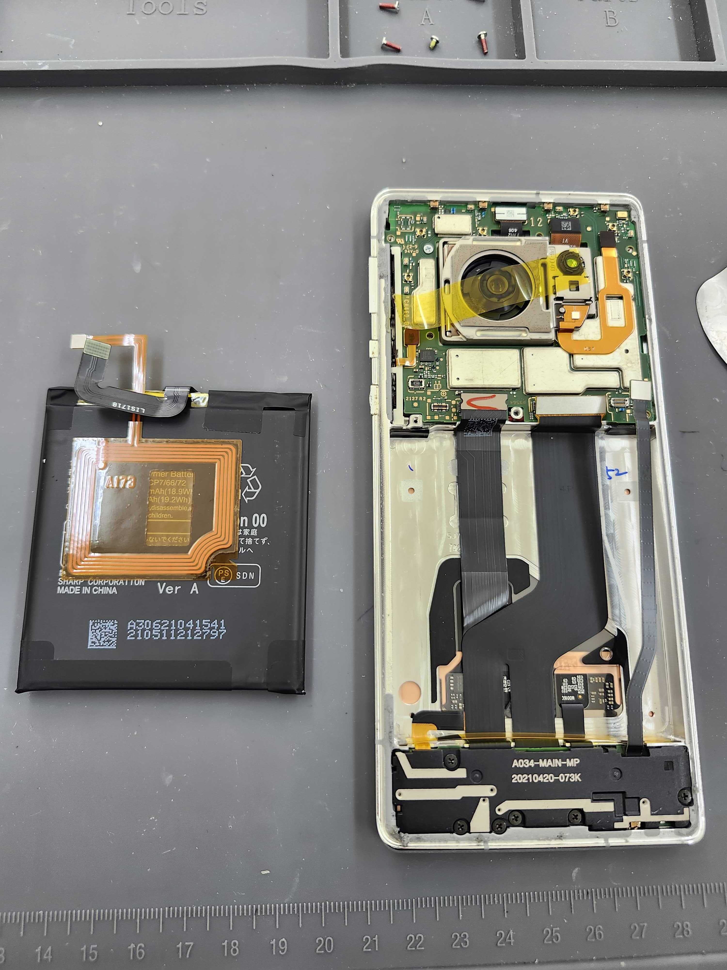AQUOS R6のバッテリーは大きく、粘着テープでしっかり固定されているため、剥離する工程が特に慎重さを要します。