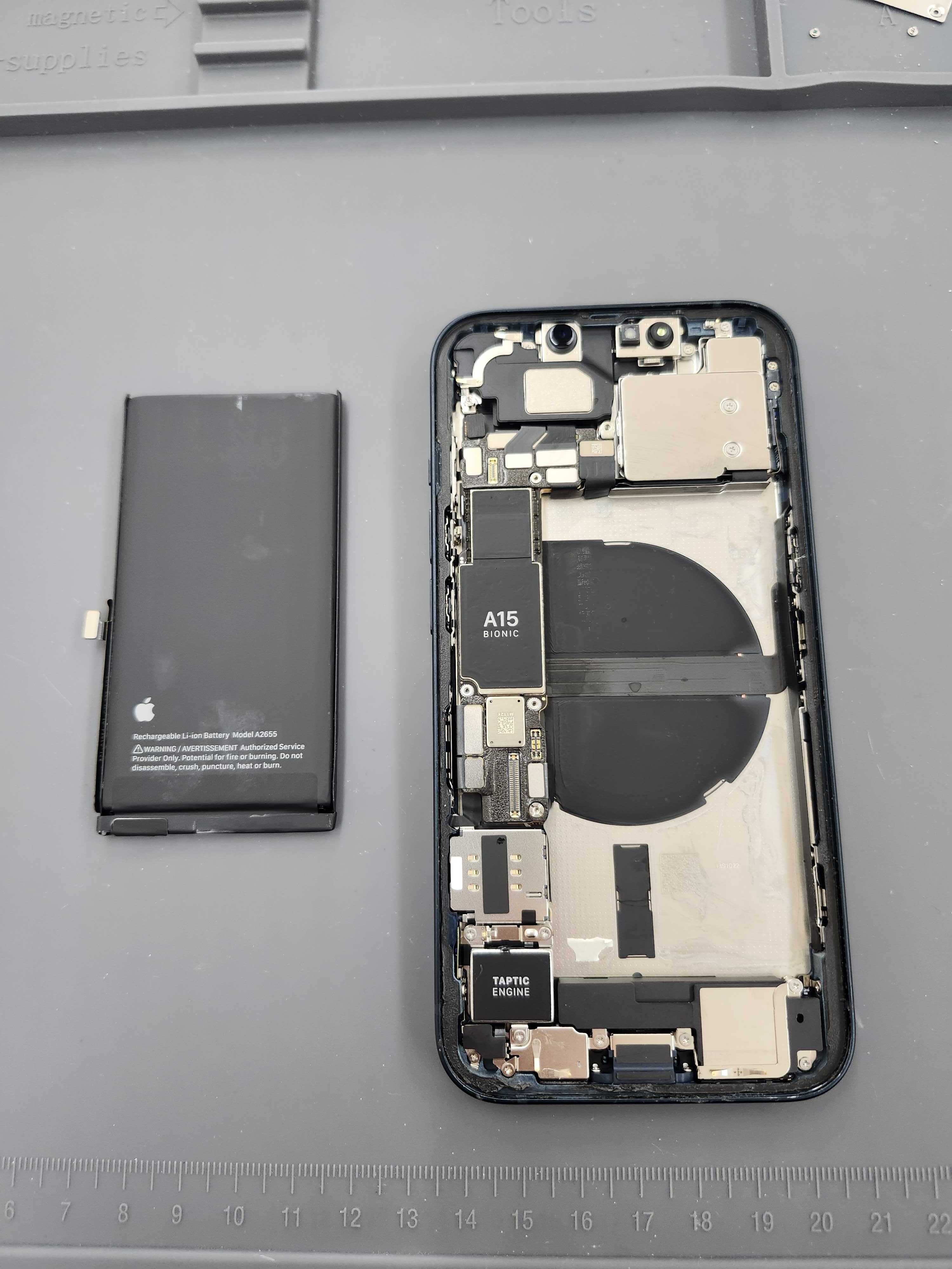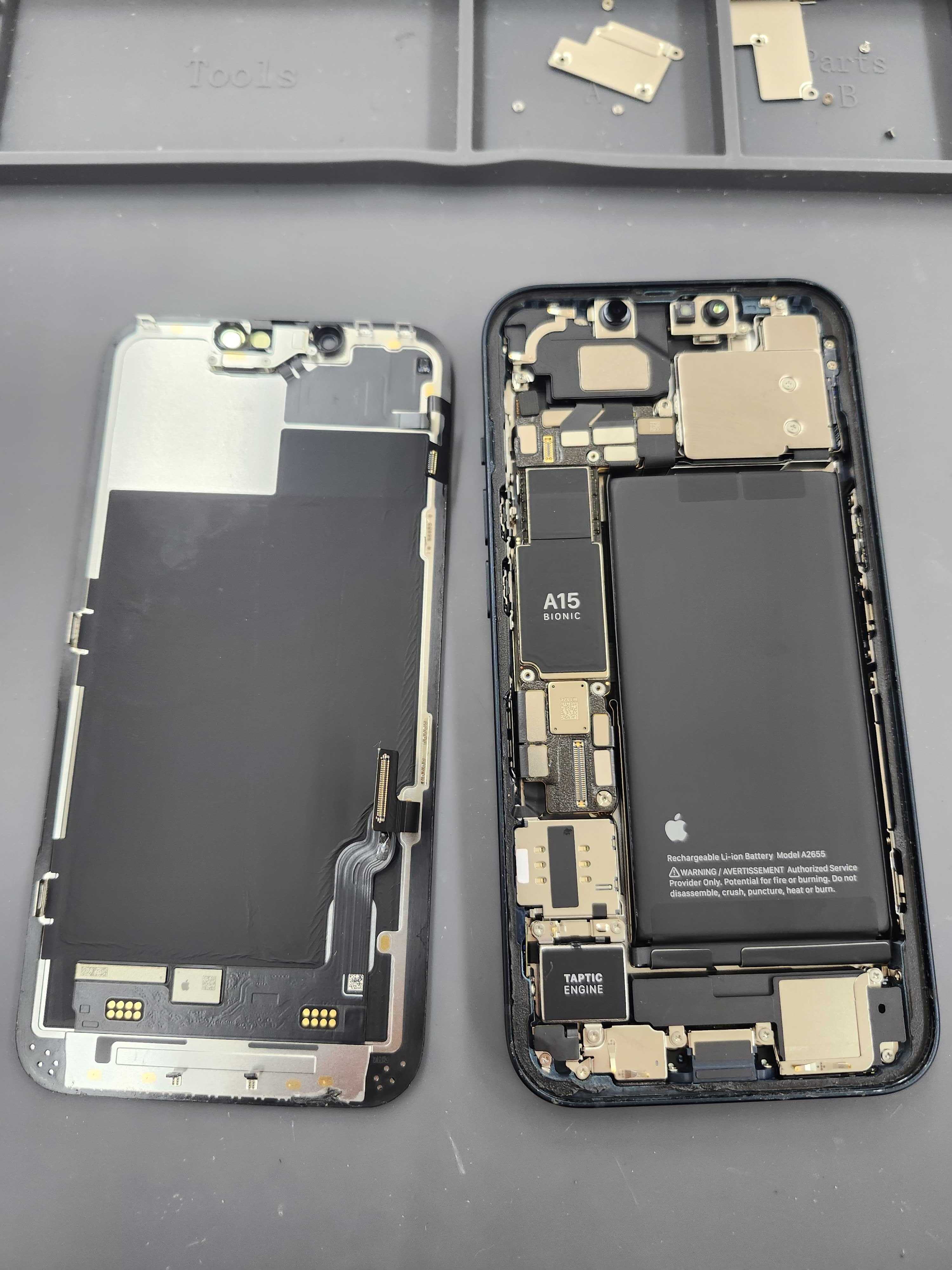 内部にはA15 BionicチップやFaceID関連パーツが詰まっているため、