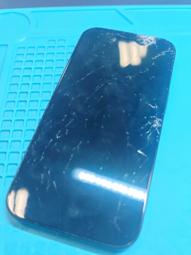 お持ち込みいただいたiPhone16 Proは、画面全体に細かなヒビが入り、特に端の割れがひどい状態でした。