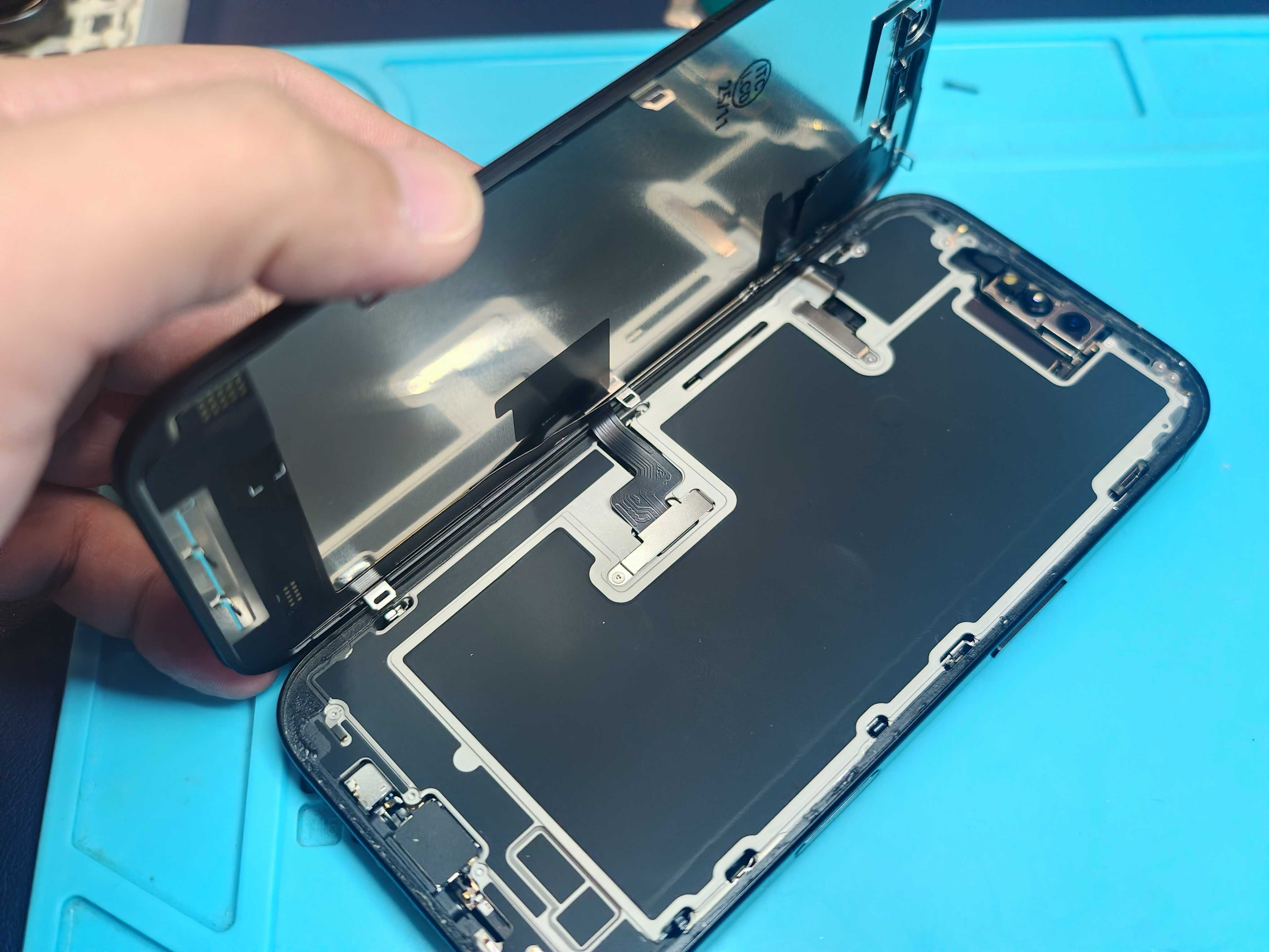 その後、Face ID関連のセンサーパーツを損傷しないように取り外し、新しい画面へ移植します。