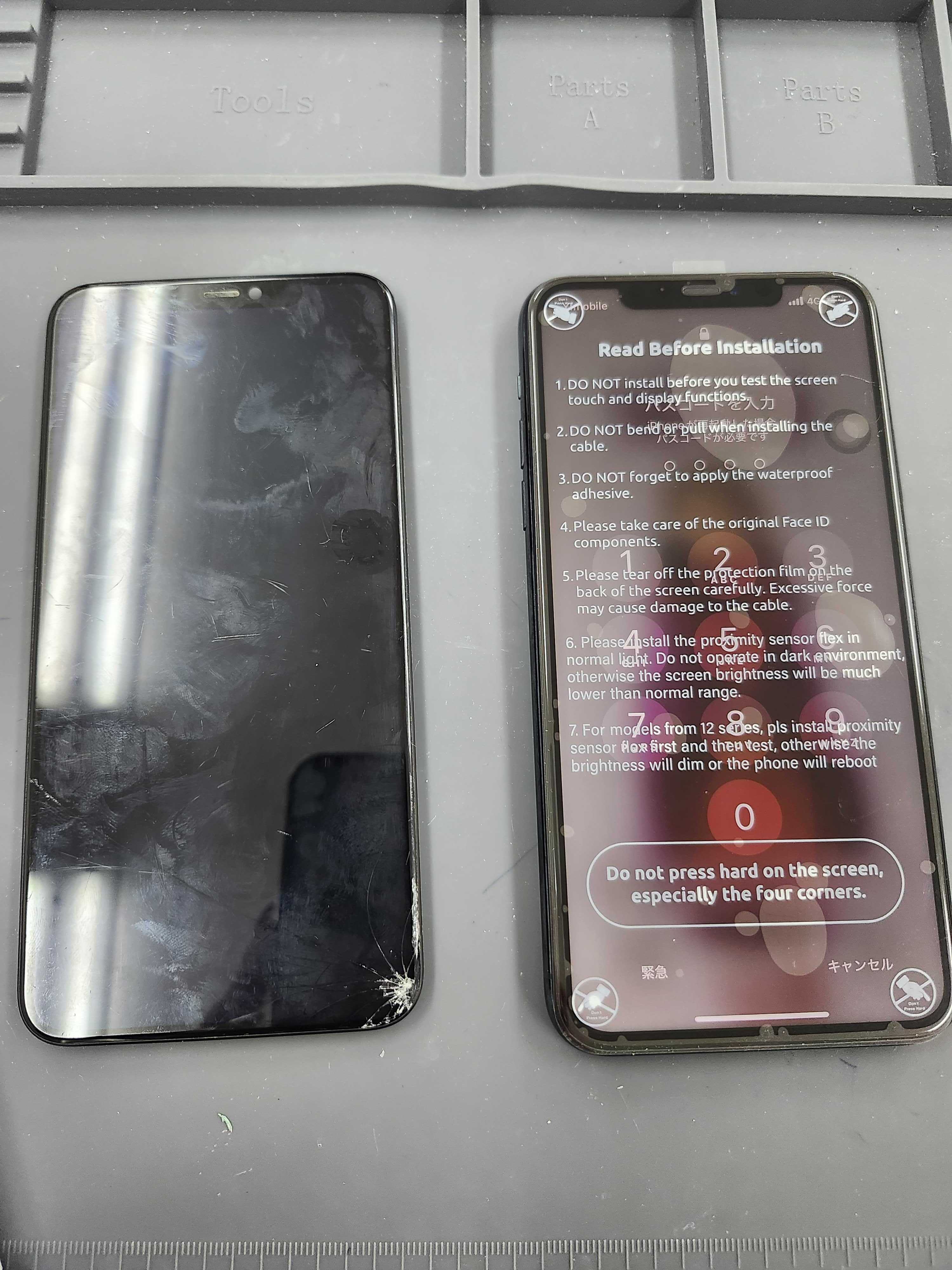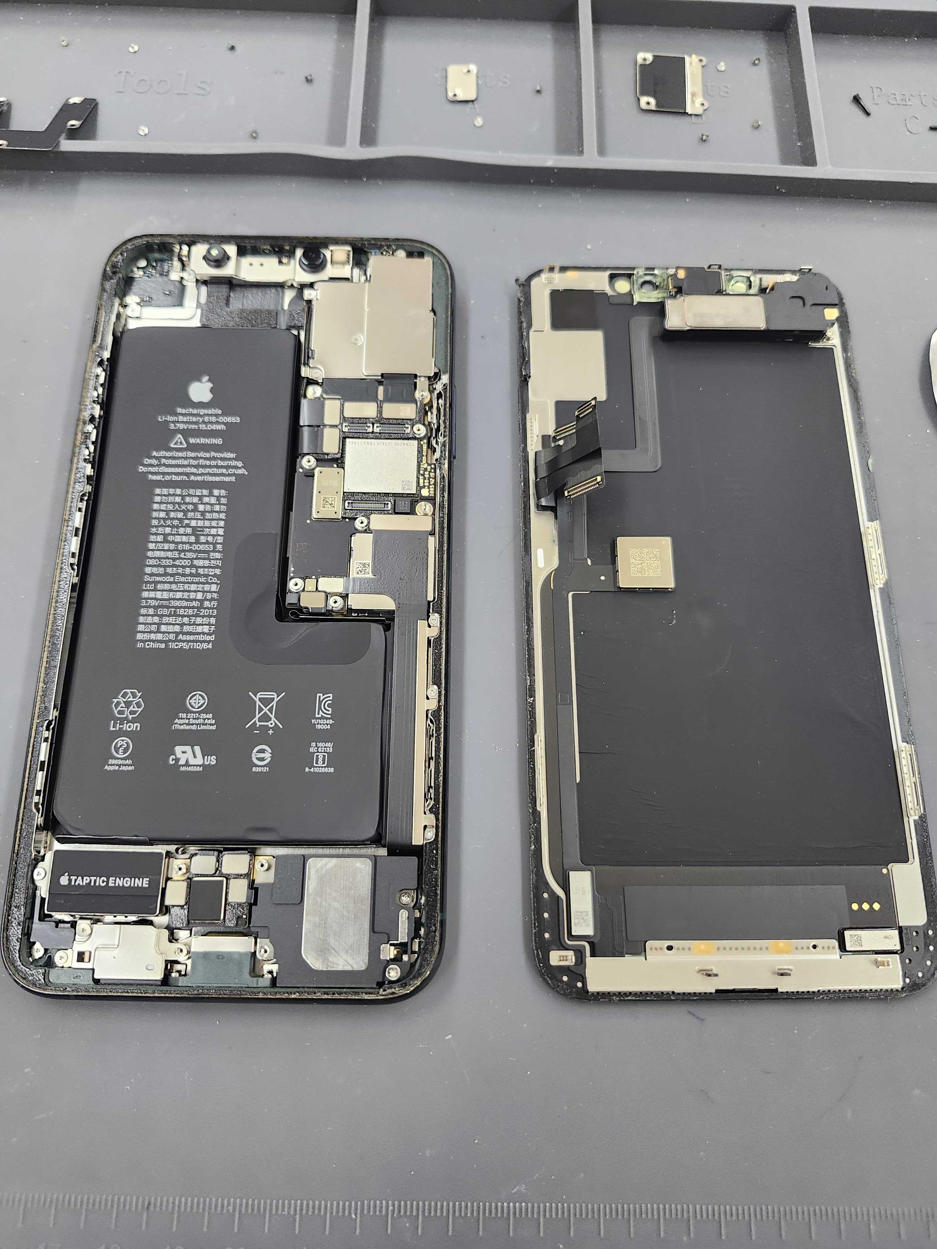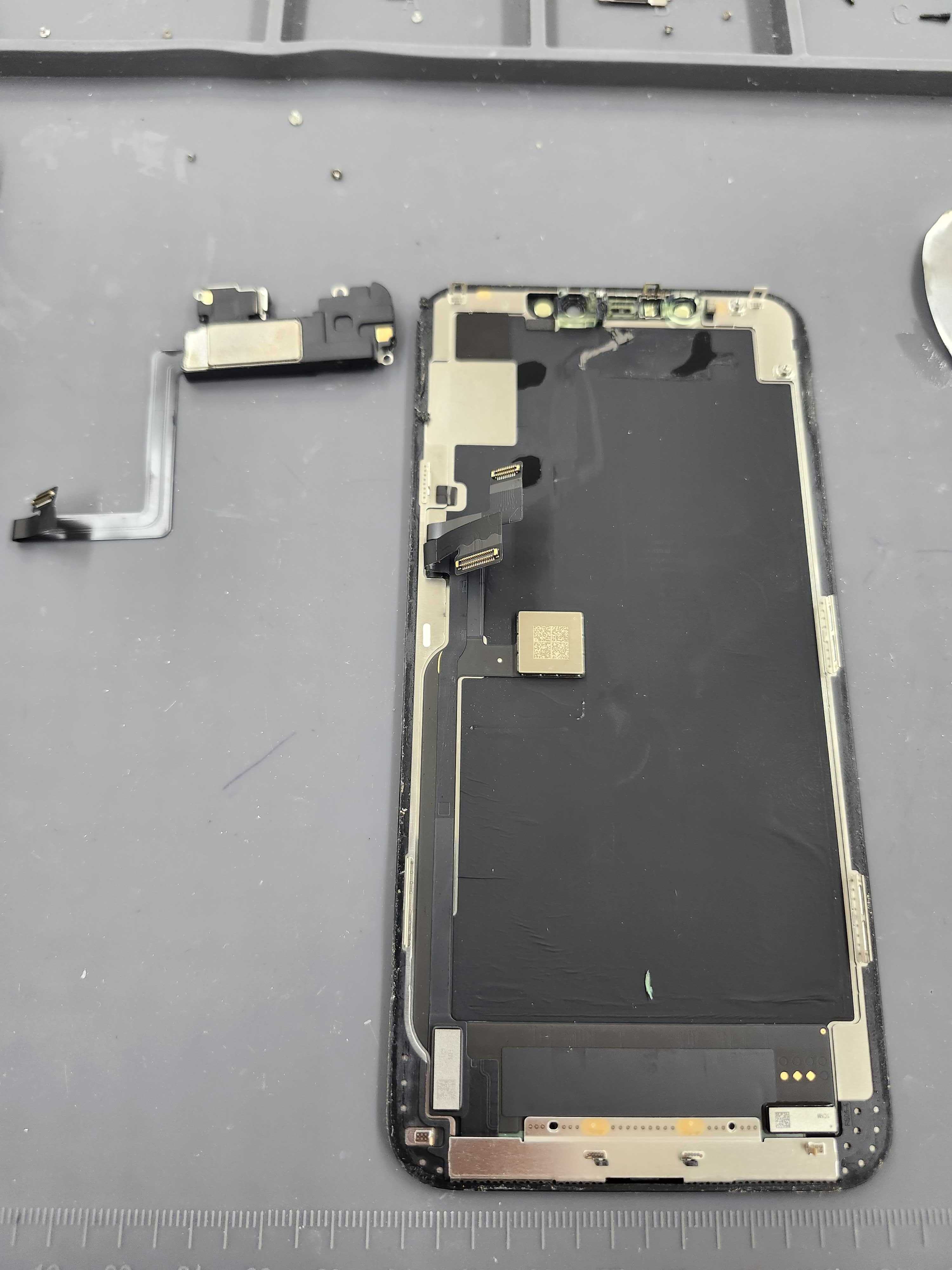 Face IDユニットなど重要パーツは元のものを使うため、慎重に取り外して新しいパネルへ移植します。