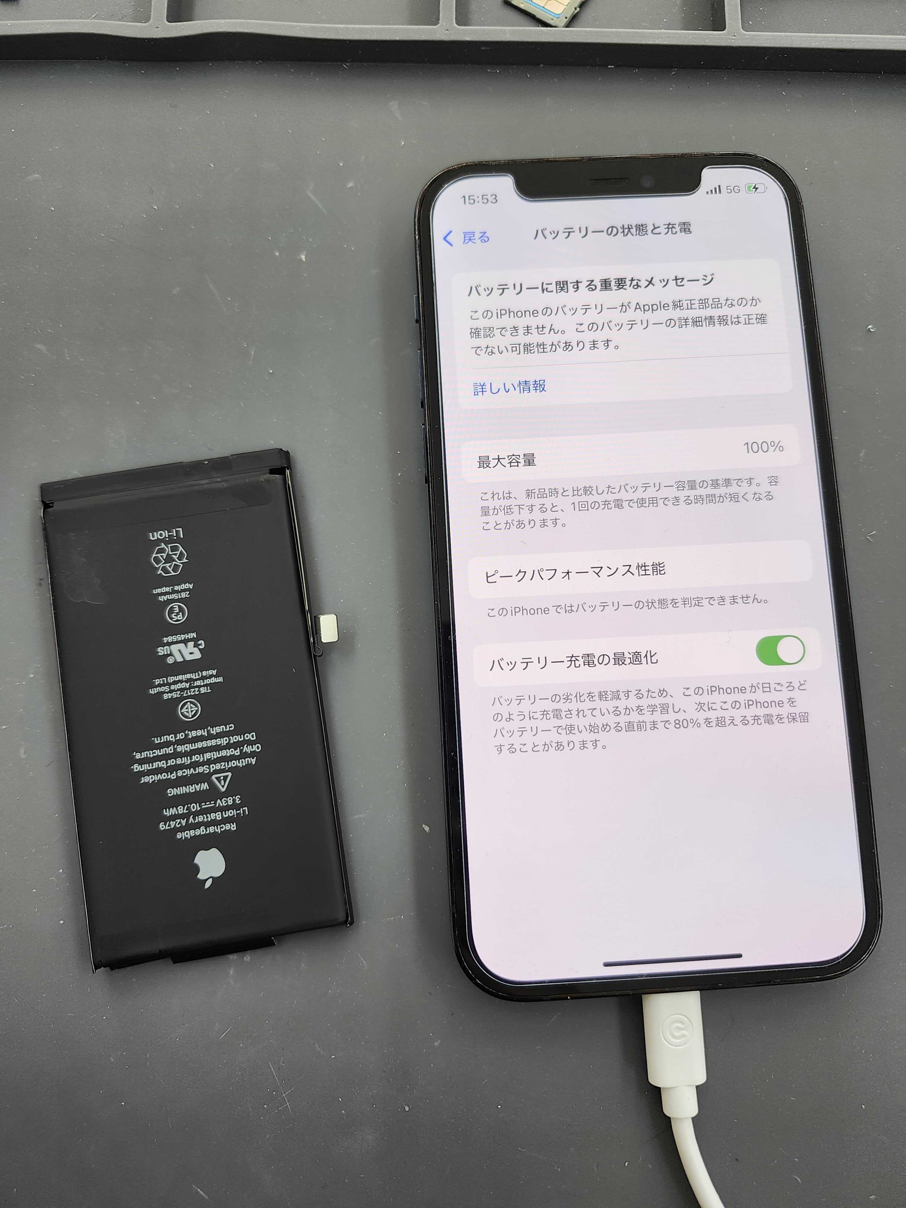 最近、iPhone12シリーズで「バッテリーに関する重要なメッセージ」が表示され、ご相談いただくケースが非常に増えています。