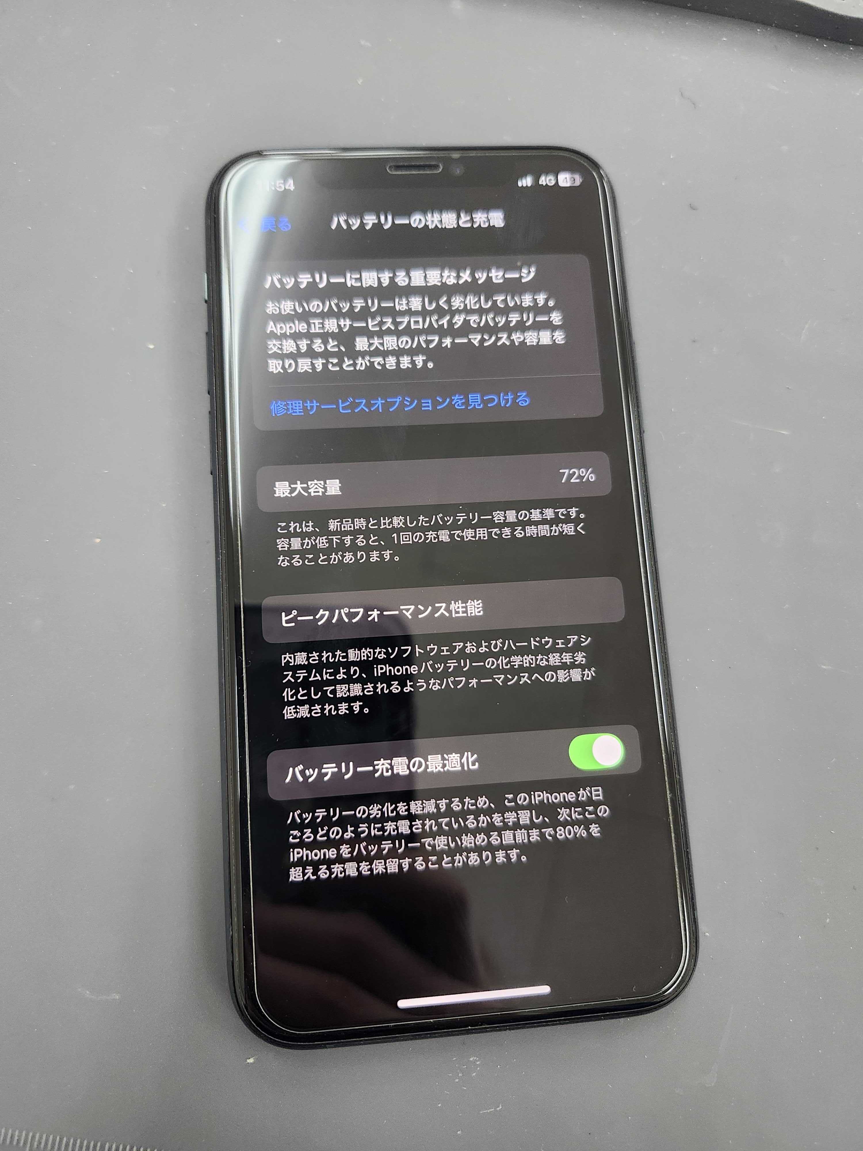 こちらの最大容量が80%を下回る、もしくはAppleさんの方よりバッテリーが劣化しているとメッセージが届いておりますとバッテリー交換の目安となります!😖
