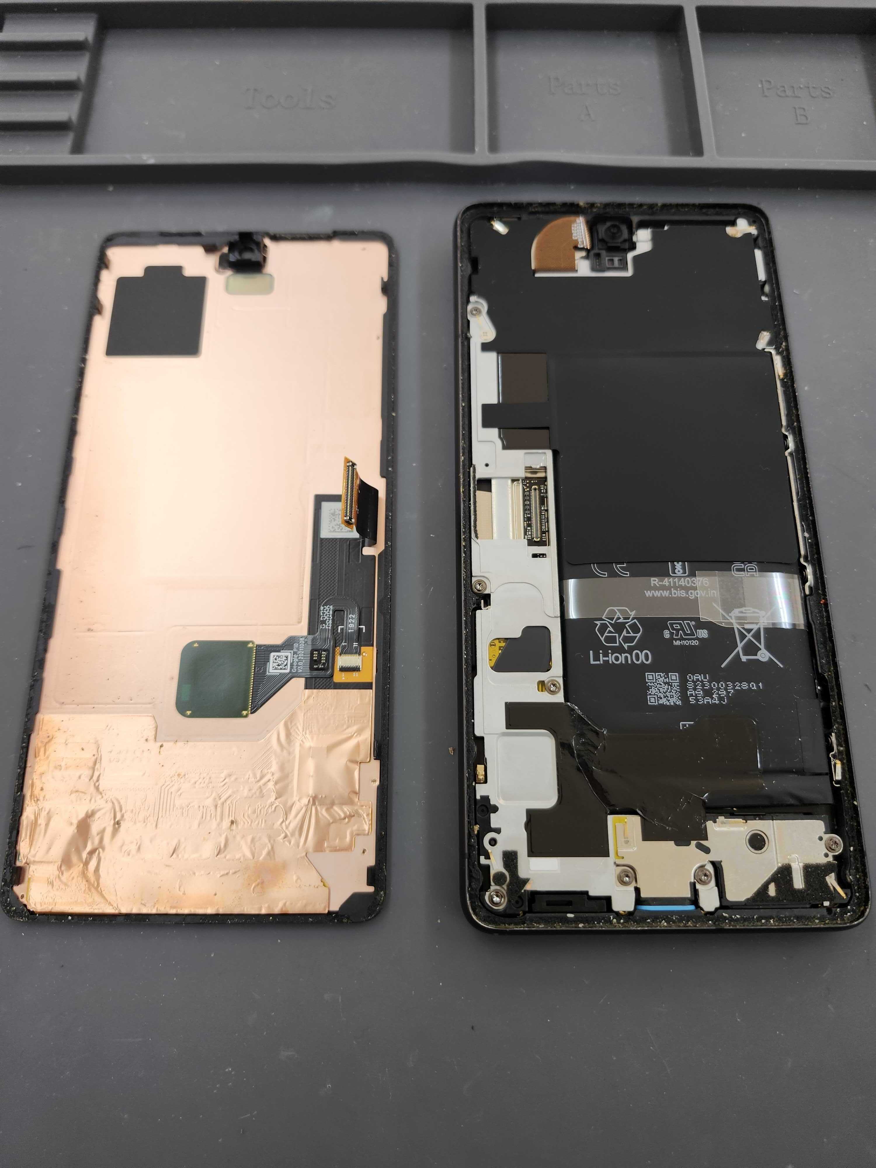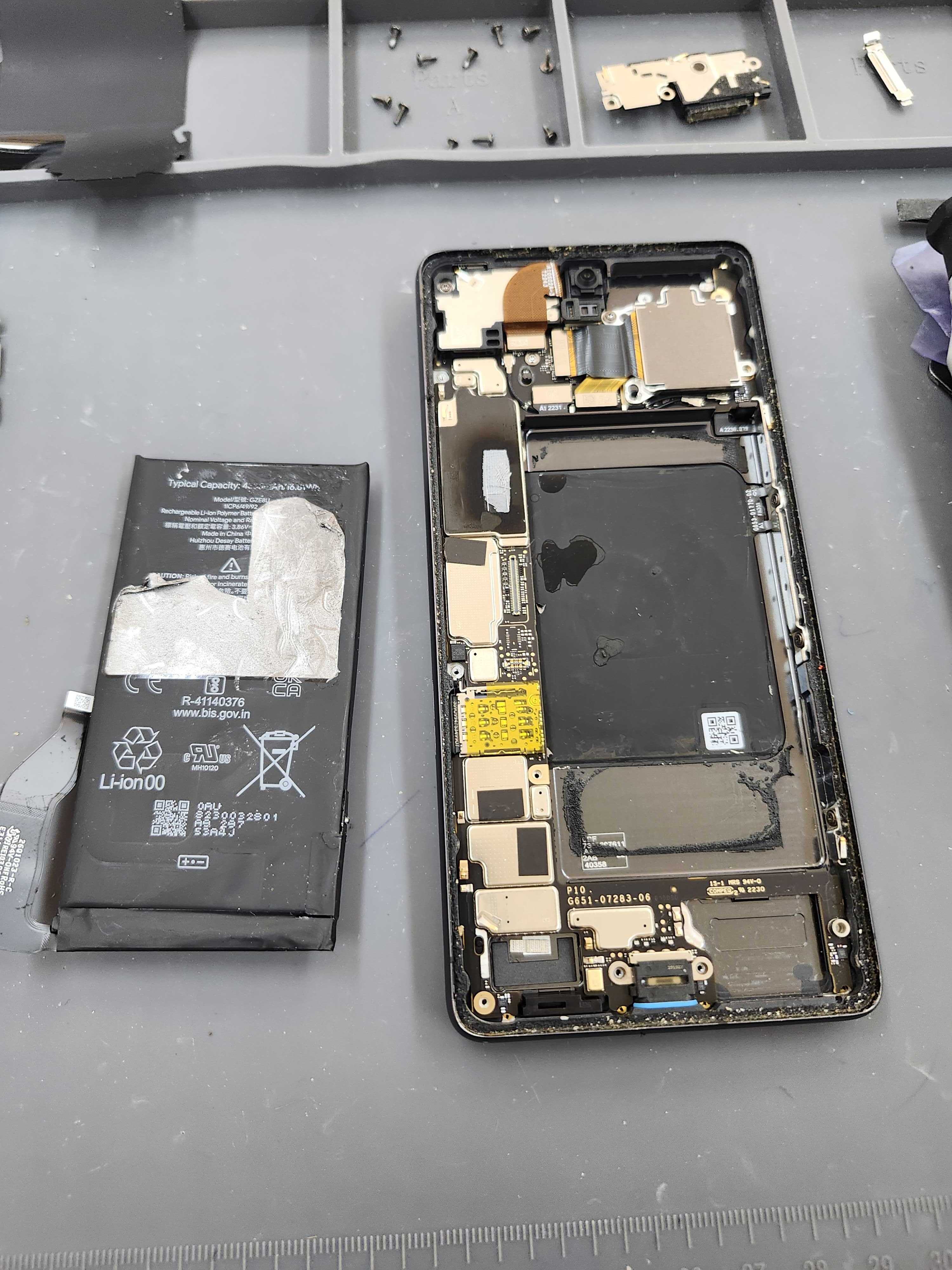 Pixel7はバッテリーが強力な粘着テープで固定されており、丁寧な剥離作業が必要です。