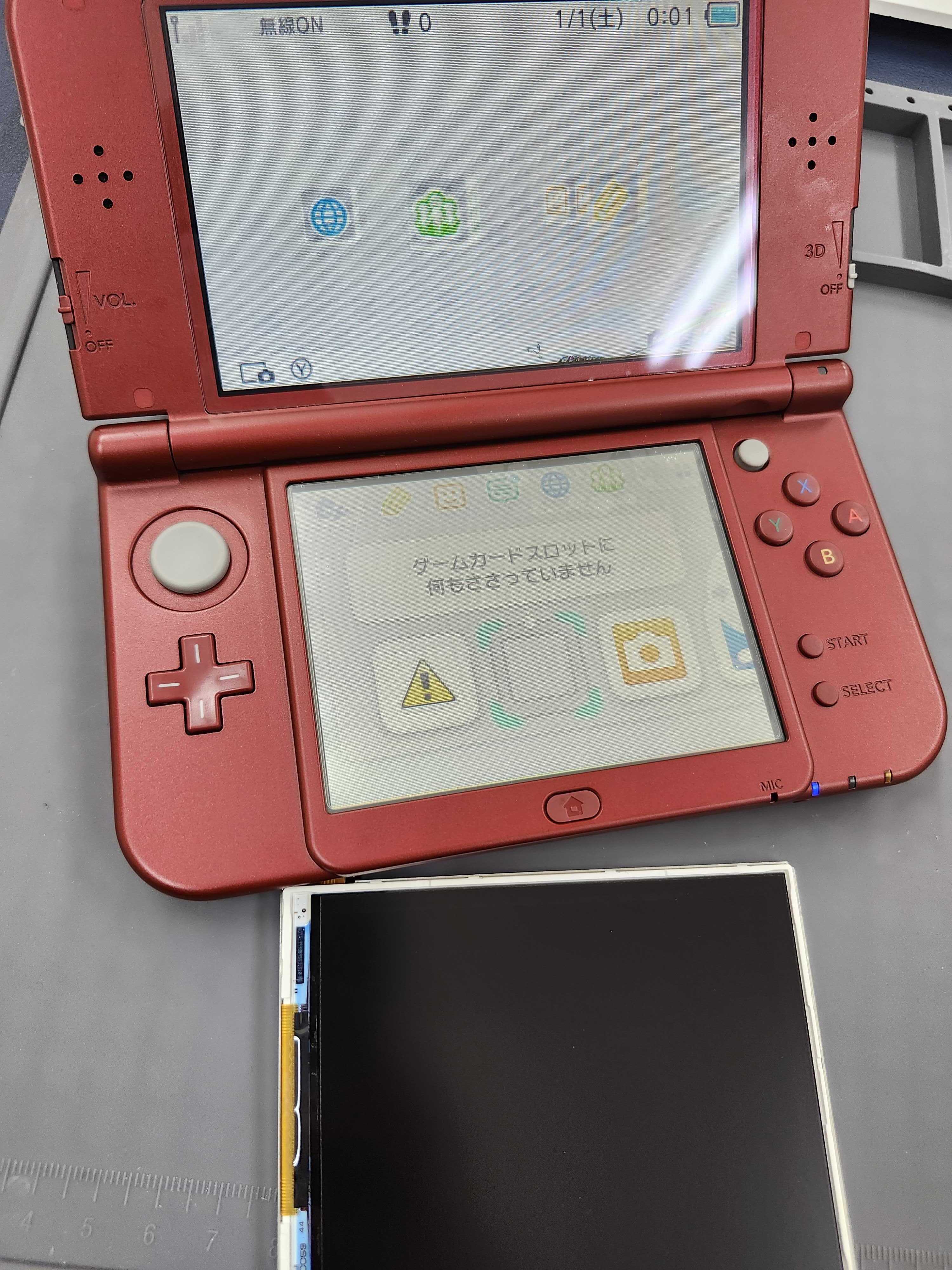 今回は液晶内部の破損により、下画面の表示に線が入る液晶不良が発生していました。