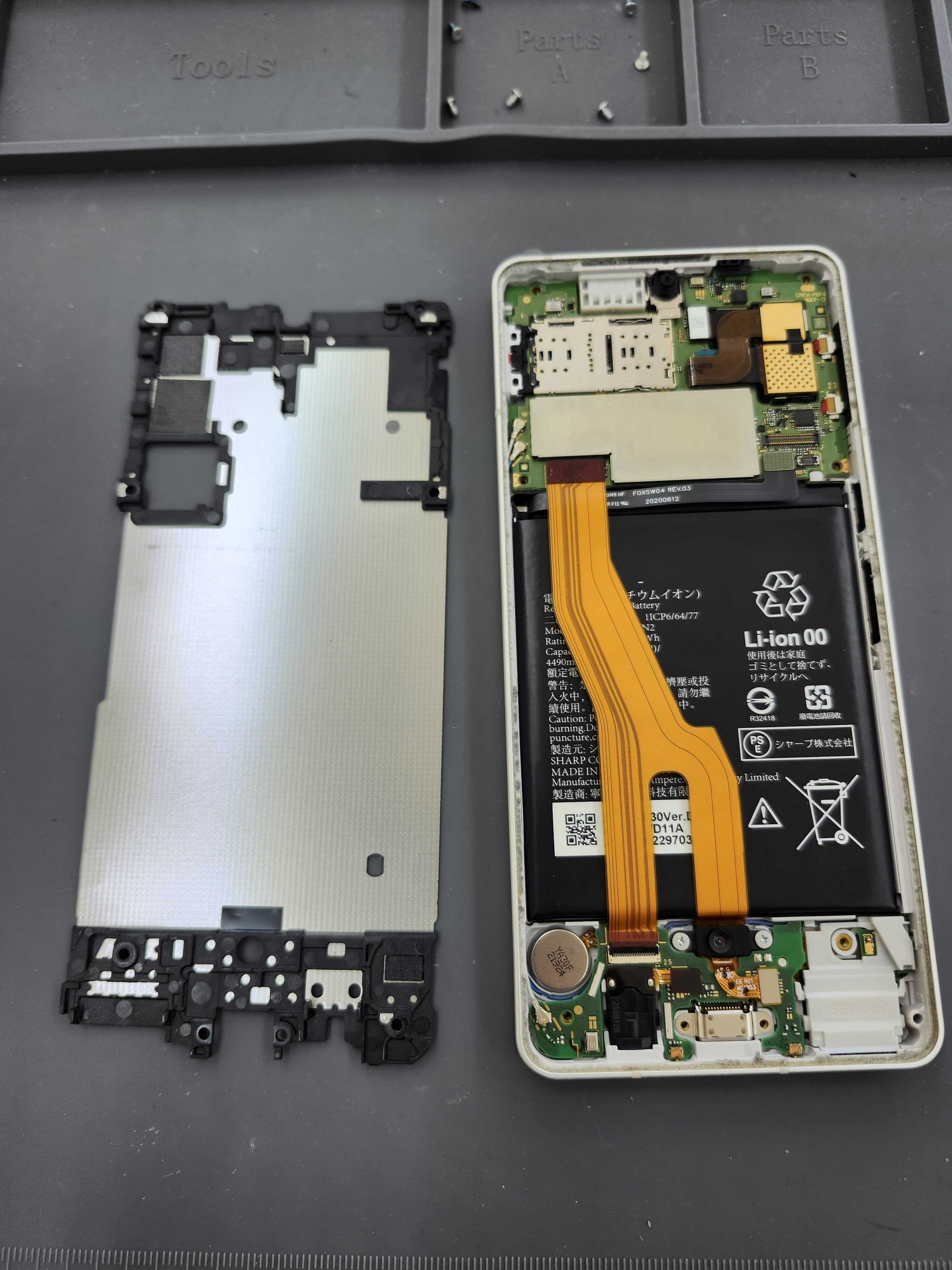 AQUOS sense6は背面ではなく 画面側から開く構造 のため、慎重に分解していきます。