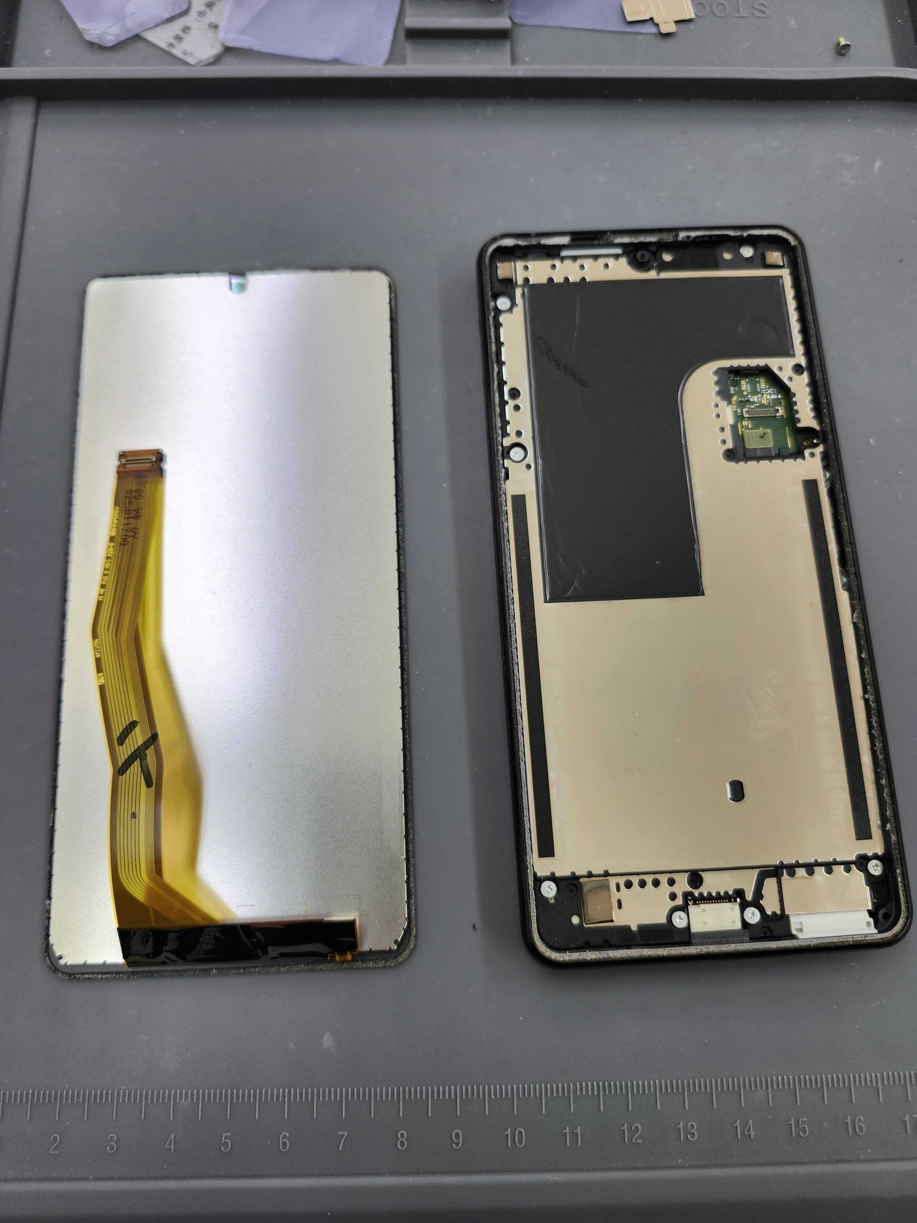 画面側には細いフレキケーブルがあるため、断線させないよう慎重に作業します。