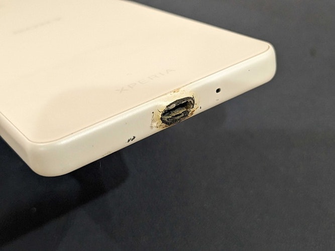 実際に端末を確認すると、充電口(USB-C端子)が焼けてしまっている状態でした。